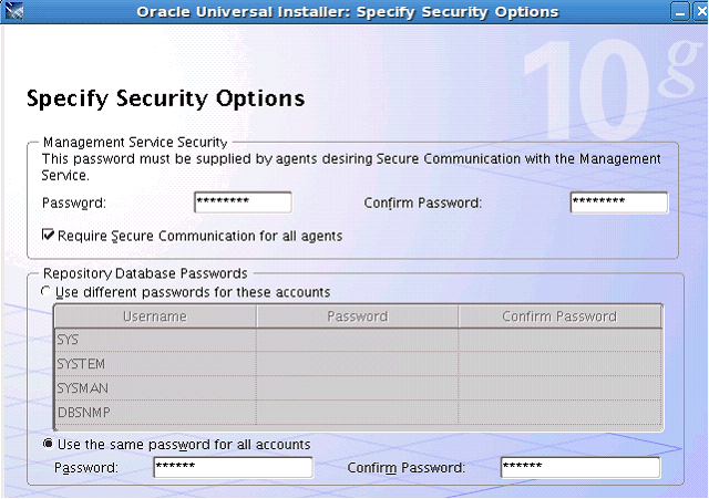 設置密碼要求: 5-30個字符長, 不能同于用戶名, 必需包含大小寫字母和數字, 必須以字母開頭, 不能含有oracle保留字, oracle這裏本身的密碼提示不完全正確.