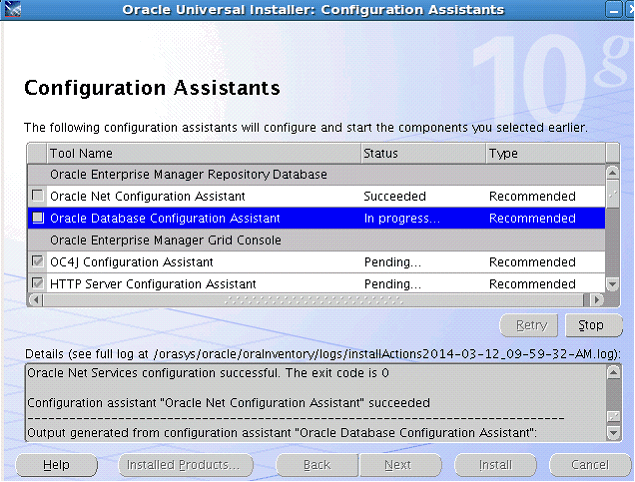 此時可以到 $ORACLE_BASE/oraInventory/logs 下查看最新安裝日志文件installActionsxxx.log, 了解安裝進度. 安裝步驟如下: